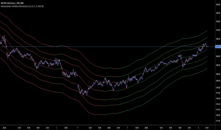This variation uses the Hull Moving Average as the centre line for the channel.
