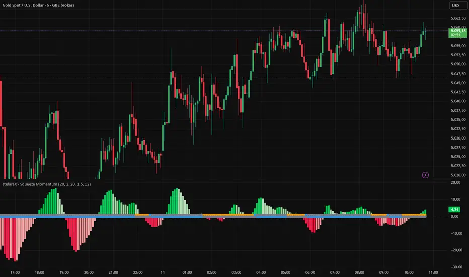stelaraX – Squeeze Momentum is a volatility and momentum indicator designed to detect compression phases and visualize directional pressure during and after the squeeze. It compares Bollinger Bands against a Keltner Channel to identify “squeeze” conditions and uses a linear regression momentum histogram to estimate breakout bias.