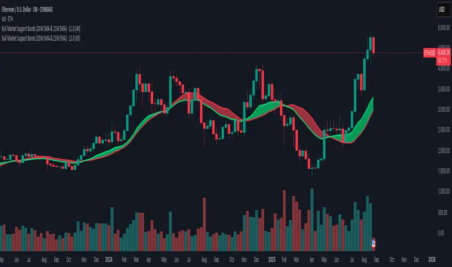 This indicator plots the 20-week Simple Moving Average (SMA) and the 21-week Exponential Moving Average (EMA), together forming the Bull Market Support Bands (BMSB).