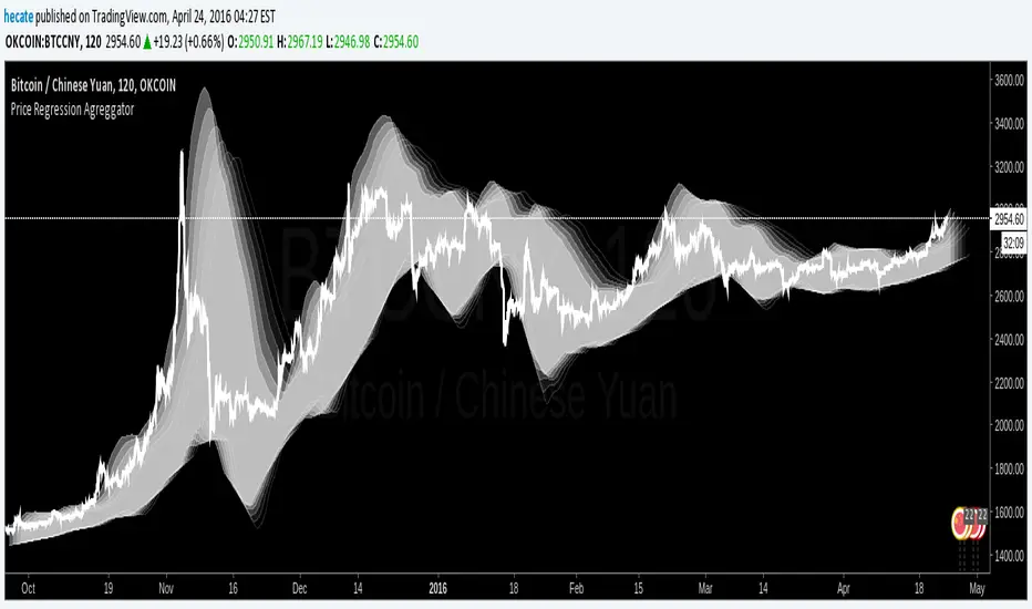 It uses 6 linear regression from time past to get an estimated point in future time, and using transparency, those areas that are move "visited" by those 6 different regressions and maybe more probable to be visited by the price (in fact if you zoom out you will see that price normally is around the lighter zones) have more aggregated painted colors, the transparency is lower and well, the lighter area should be more probable to be visited by the price should we put any faith on linear regression estimations and even more when many of them coincide in several points where the color is more aggregated.
