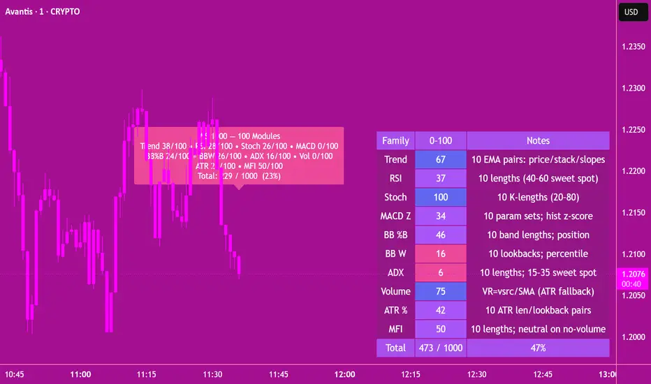 A plug-n-play market “weather station” that compresses 100 popular signals into one composite grade. Ten indicator families × ten variants each → a 0–100% readiness score (with GO / NO-GO alerts), plus a mini dashboard table and a draggable badge.