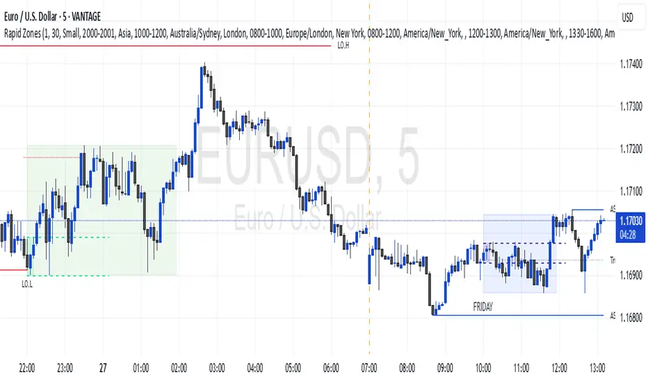 Tired of manually marking out trading sessions and key levels every day? The Rapid Ultimate Trading Zones indicator is a comprehensive, institutional-grade tool designed to automatically visualize the most important price and time levels on your chart.
