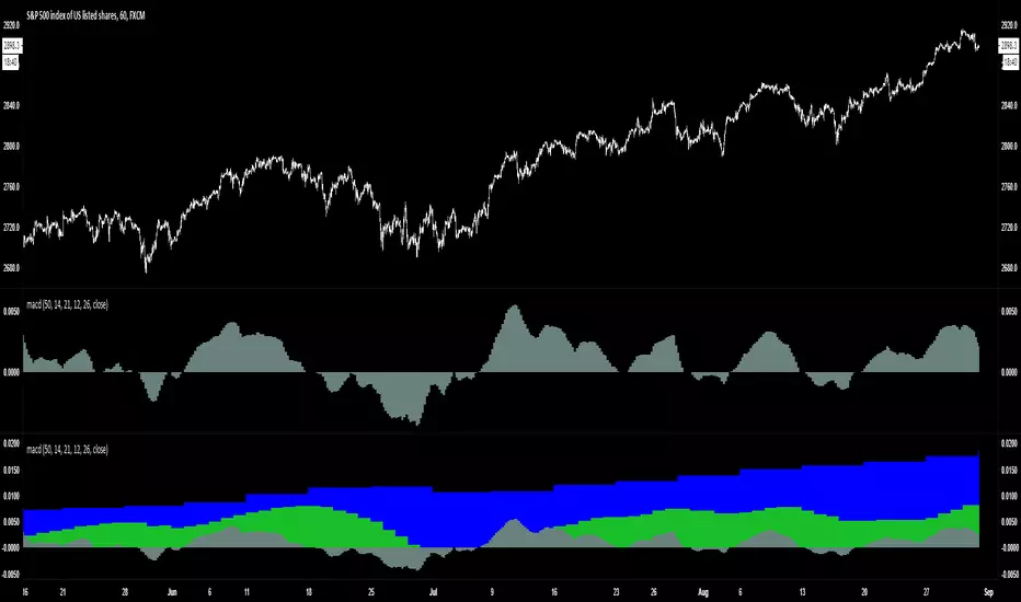 Default MACD formula filtered by an RSCD, a Relative Strength Index midpoint transpose over a 21 length moving average.