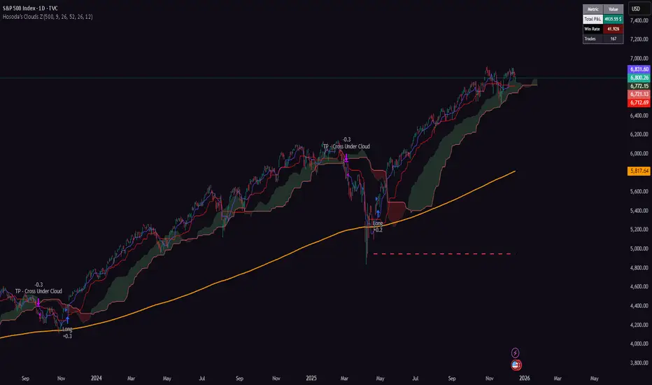 Hosoda’s Clouds is a trend-following strategy designed to trade only long positions in traditionally trending markets with a strong bullish bias: SPY(D); DJI (D); NDX (D); XAUUSD (D); Tesla (D, H4, H1); AAPL (D, H4, H1); GOOG (D, H4); META (D, H4); NVDA (D, H4); AMZN(D, H4).