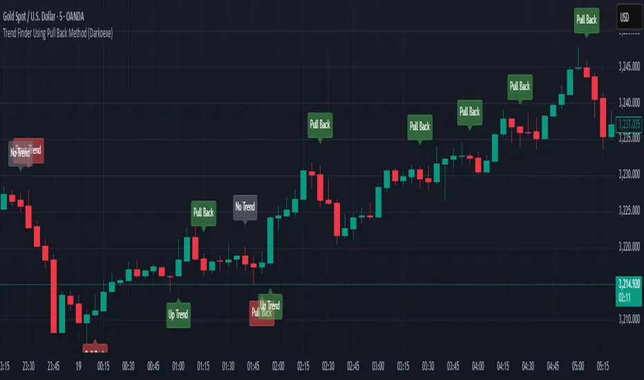 If the conditions for an up trend or down trend are not met, no trend will be printed. Both bearish and bullish pull backs will be displayed during a no trend.