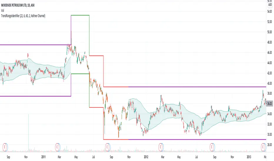 - If close price does not break either upLine or downLine for rangeLength bars, then the instrument is considered to be in range. During this state, candles are colored in silver and upLine/downLine are colored in purple.
