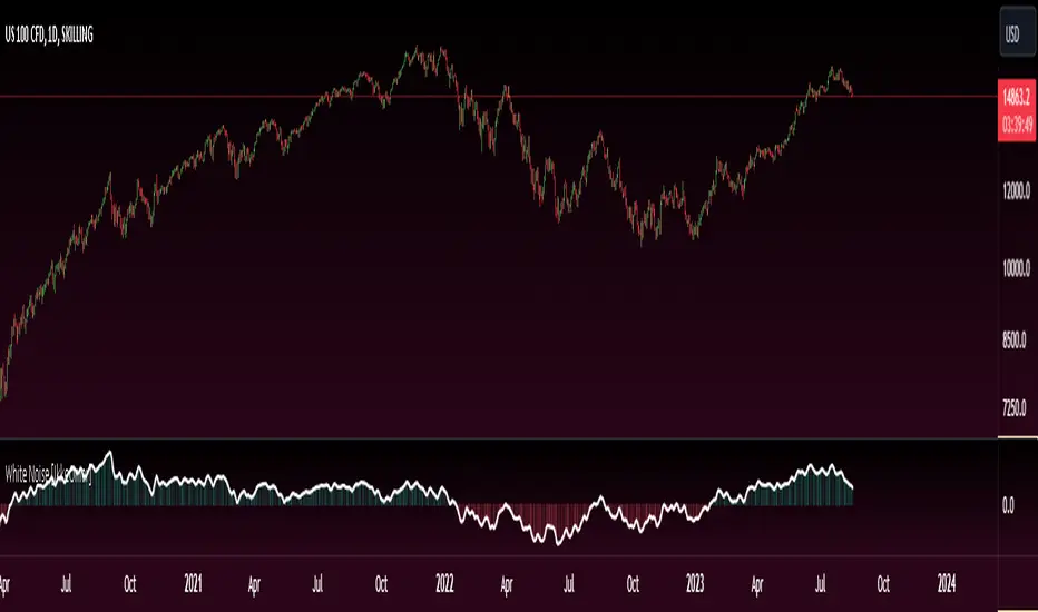 The "White Noise" indicator is designed to visualize the dispersion of price movements around a moving average, providing insights into market noise and potential trend changes. It highlights periods of increased volatility or noise compared to the underlying trend.