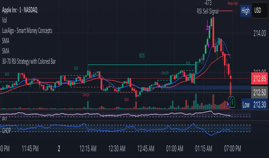 This script colors price bars based on Relative Strength Index (RSI) levels, giving traders a quick and visual way to assess overbought or oversold market conditions directly on the chart.