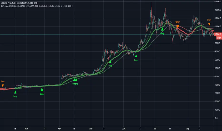 This indicator works best for long trends on the 4h timeframe and will tell you when the trend has reversed. Best used to find your buy in points if you are wanting to accumulate BTC over long timeframes. This indicator also works well at picking the switch in direction on the 15m timeframe however this is much more risky and I would only recommend for experienced traders. If you are looking for something to give you long term entries on BTC then this will be able to help you. It is not always accurate and I would recommend using it to tell you when to buy if you are considering holding your BTC long term.