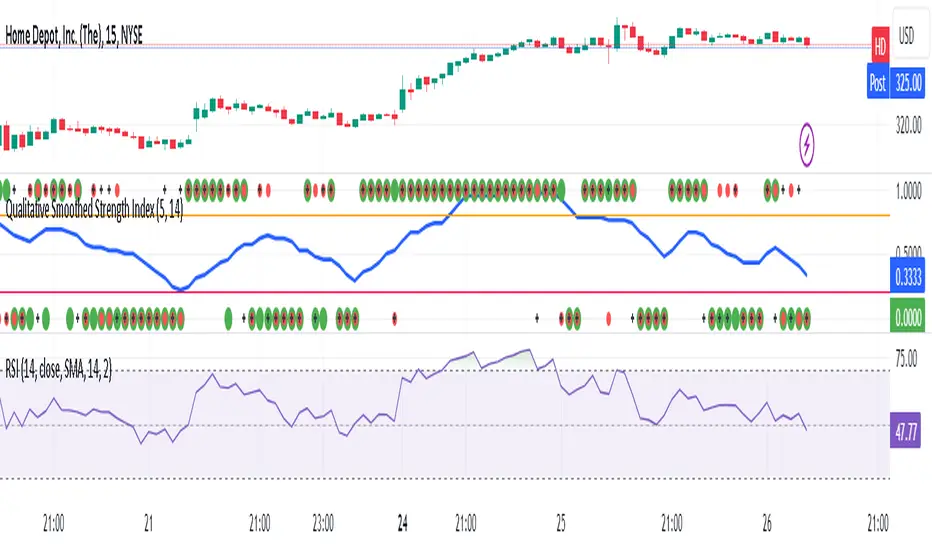 The Qualitative Smoothed Strength Index (QSSI) is a simplified momentum oscillator whose values will oscillate between 0 and 1 . By converting price differences into binary values and smoothing them with a moving average, it identifies qualitative strength of price movements. This simplification allows traders to easily interpret trends and reversals. The QSSI offers advantages such as noise reduction, clear trend identification, and early signal detection, resulting in less lag compared to traditional oscillators. Traders can customize the indicator based on their preferences and use it across various markets.
