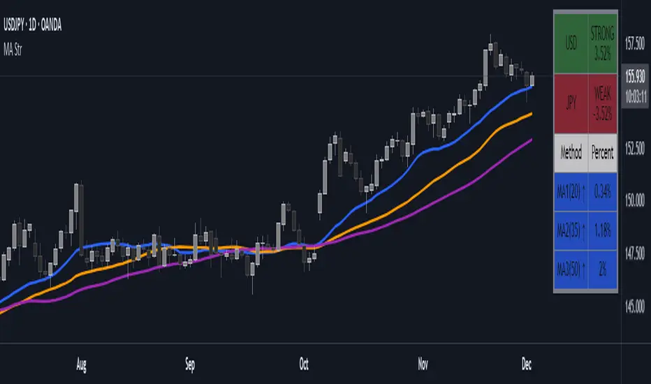 The "MA Strength" is an indicator that measures market trend strength or (in the case of forex pairs) the relative strength of individual currencies based on up to five different moving averages (MA). It offers multiple calculation methods, such as simple summation, normalized value, or measuring ATR/percentage distance from the price. The results are summarized in a clear table, and it provides customizable alerts for trend changes or shifts in currency strength. The high level of configurability (e.g., MA weighting, "all MA alignment" requirement) allows for fine-tuning the strategy.