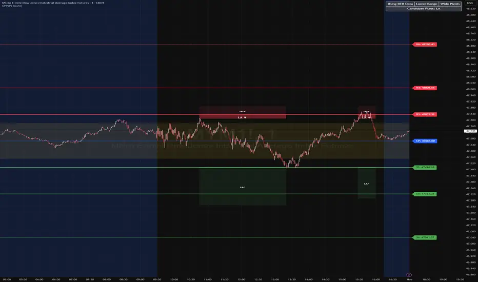 The pivots can be calculated using only RTH (Regular Trading Hours) data, or ETH (Extended Trading Hours) data, which includes the pre-market and post-market. The indicator implements logic to automatically choose the correct data, based on the rules defined by the strategy. This is user-overridable. With the default options, ETH will be used when the H/L range in the previous day's post-market or current day's pre-market exceeds that of the previous day's regular market. In auto mode, the chosen pivots are considered the main pivots for that day and are the ones used for play evaluation. The "other" pivots can also be shown*—"other" here meaning using ETH data when the main pivots use RTH data, and vice versa.