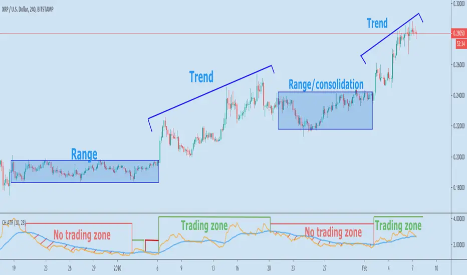 As you can see in the chart, when the ATR line (orange line) is below the blue line, the price is not volatile and it is likely to be ranging. On the other hand, when the ATR line is above the blue one, the volatility of the market is increasing, which means that the price is initiating a new trade and there will be more trading opportunities.