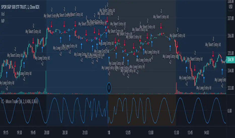 Makes trades based on the moon's elliptical cycle. Only "works" at a 1m, 1h, 1d scale, highly experimental and is only using the crudest orbital math. Please do not use this strategy for anything other than research. At this point, it was just a feasibility test. Let me know your opinions. Thank you.
