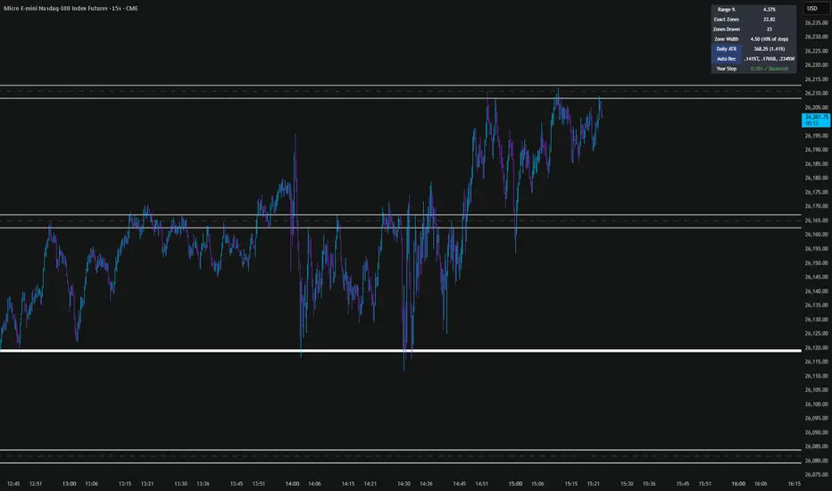 Purpose: Automatically creates zone-based support/resistance levels within a dealing range using percentage-based spacing with ATR-driven recommendations.