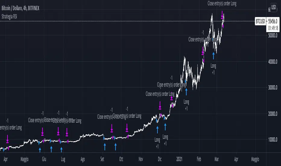 Questo semplice script sfrutta il RSI a 14 periodi per comprare (solo long) quando RSI crocia al rialzo i 30 (oversold line) e chiude l'operazione quando RSI crocia al ribasso i 70 (overbought line).