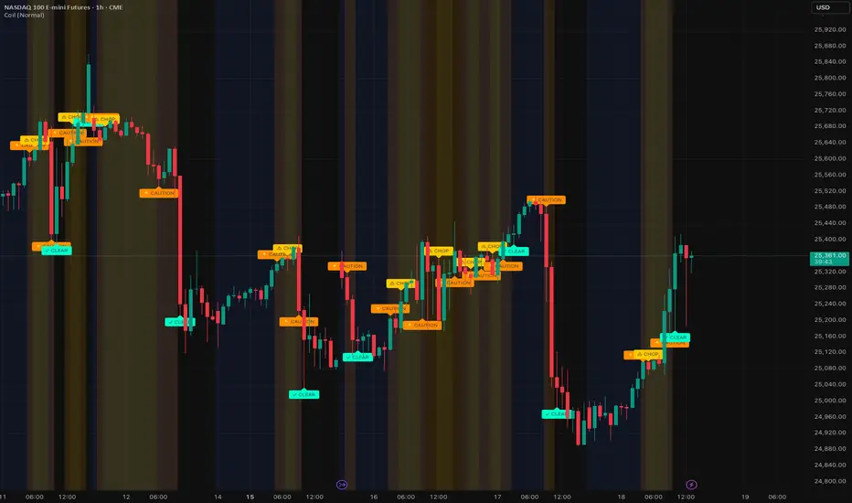 Coil is a market state classification tool designed to help traders avoid low-quality conditions such as sideways price action and unstable transitions between trends. Instead of producing entry or exit signals, Coil focuses on identifying when directional trading is statistically unfavorable and when conditions begin to stabilize.