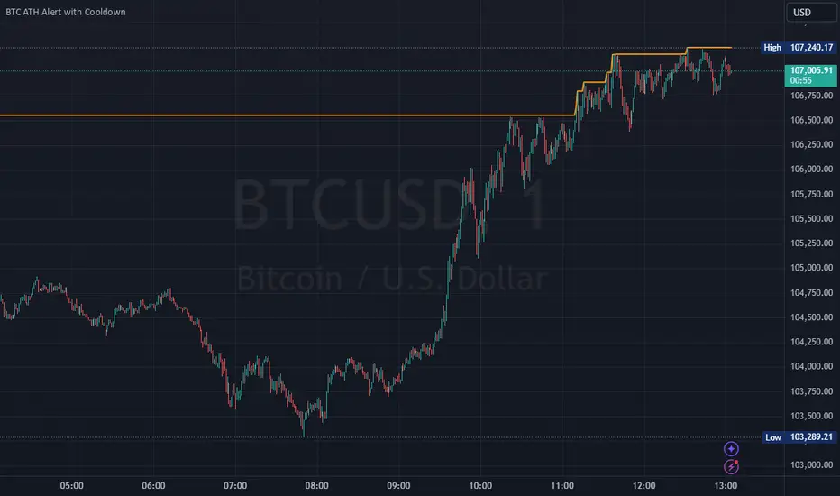 This indicator tracks new all-time highs (ATHs) and alerts you when Bitcoin (or any asset) reaches a fresh ATH, while avoiding alert spam with a customizable cooldown period.