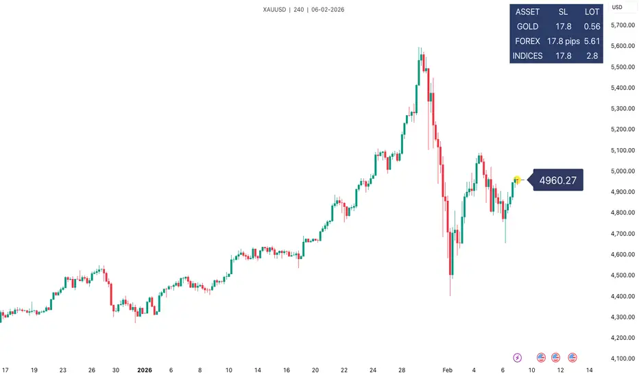 A clean, MT5-accurate position sizing tool that instantly calculates lot size based on risk and stop-loss range. Designed for discretionary and prop-firm traders who want fast, no-nonsense sizing without manual math. Supports Gold (XAUUSD), Forex pairs, and Indices, with clear on-chart dashboard output.