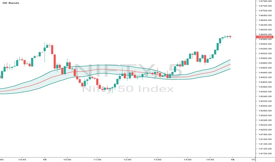This Bands are formed based on Bollinger Bands. The middle line shows moving average and remaining upper and lower bands are like zones wheh this this band is narrow then price consolidation stage similarly this band are expand then market will trending