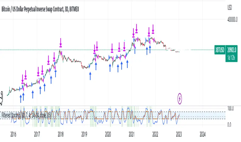 this indicator allows a trader to be present during bullish/parabolic trends by only triggering if the close is > than the highest 6 candle average high over the last 30 candles. This filter requires the market to be in a generally bullish posture. If the market is in this condition the stochastic RSI indicator value offers a good gauge of price action and only goes significantly down if price trends below the average range of the rsi period. This filters out noise and keeps a trader from over trading on inconsequential corrections while responding fairly quickly to changes in general trend direction. the response is fast enough to produce an unprofitable amount of false signals if the bull market filter is not implemented. However when used in combination the signals return desirable results in bull trending markets.