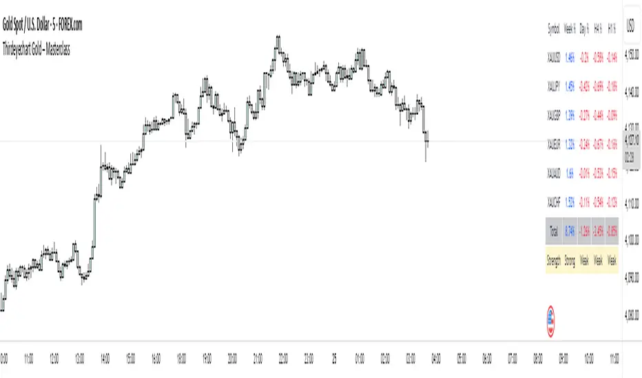 The XAU Masterclass — Final Fix is the definitive TradingView indicator for serious gold traders. Built for speed and clarity, this edition combines a solid boxed layout with an advanced math logic core to detect trend strength quickly across multiple timeframes. Designed specifically for XAU and XAU-related pairs, the indicator shows percentage change on Weekly (W), Daily (D), 4H (H4), and 1H (H1), and distills those readings into a single Total Average Strength value for instant decision context.