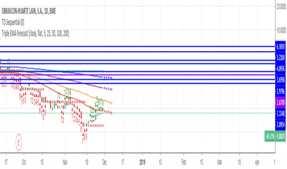 This script is an upgrade of the existing 3EMA forecast to allow the user to display 4 different EMAs (short, mid, long and very long range) and the forecast for the 5 candles ahead