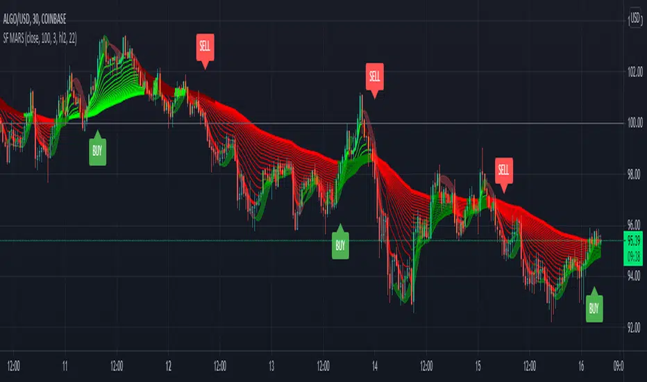 The MARS (moving average rating system) is a long-only trend following indicator that visualizes trend strength across short & medium time ranges and generates potential entry/exit points designed for swing trading & scalping
