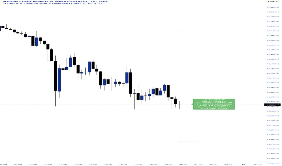 This indicator is a "heads-up display" for crypto traders who need real time risk management without manually calculating position sizes. It uses Average True Range (ATR) to dynamically place Stop Losses based on current market volatility and automatically calculates the exact position size needed to respect your risk percentage.