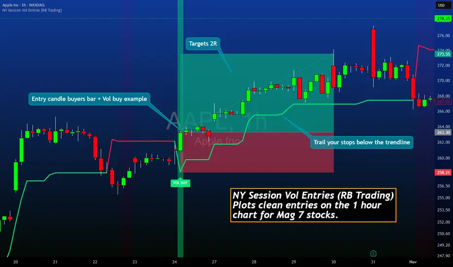 NY Session Vol Entries is an intraday analysis script designed to evaluate price behavior during U.S. market hours on the one hour chart. It focuses on the interaction between relative volume expansion, adaptive volatility structure, and directional momentum alignment to help users interpret active market conditions.