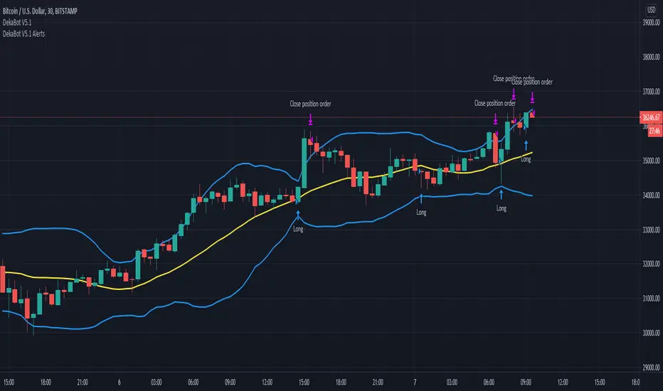 Dekabot Alerts uses a combination of Bollinger Bands , MAs and RSI to determine if the market is in an uptrend or downtrend and a custom built indicator determines when a market is oversold and overbought which creates the buy and sell signals.