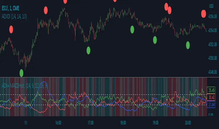 The ADX Divergence Indicator (ADXDI) is a technical analysis tool designed to identify potential bullish and bearish signals based on the Average Directional Index (ADX), the Positive Directional Indicator (+DI), and the Negative Directional Indicator (-DI) lines. This overlay indicator plots circles on the chart to highlight these signals.