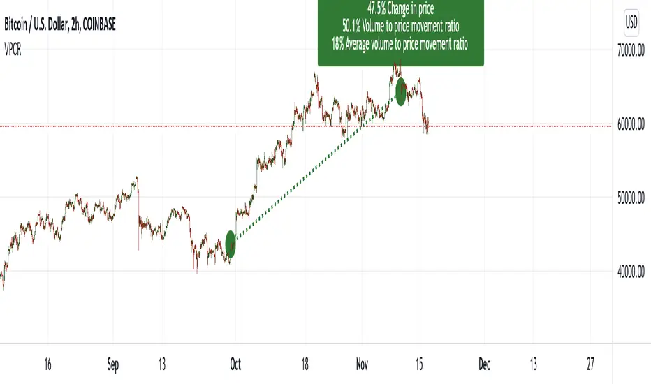 Messing around with this two point selecting ability I recently learned about from Tradingview's CAGR. Here is a script that will tell you changes in volume(obv)/price, volume to price change ratio, and the average volume to price change ratio for the length you define in the settings menu. You can use this to compare the ratio of a current pump to an older pump to help assess the strength of a movement. Enjoy!