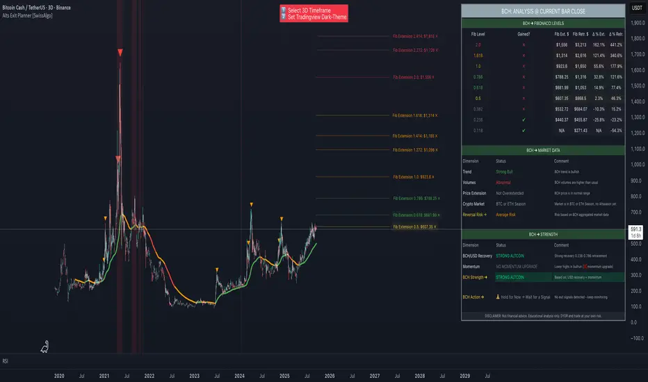 Fibonacci extension levels are used to identify potential price targets or profit zones once a market has moved past its previous high or low. Unlike retracements, which measure a pullback, extensions project how far a trend might continue in the direction of its impulse move. They are typically used to anticipate where a wave or a rally might end and are based on ratios like 127.2%, 161.8%, 261.8%, and sometimes even higher. Extensions are a key tool for traders looking to set price targets for taking profits. - Coin Strength Assessment: Evaluates recovery performance relative to previous cycle peaks and classifies assets into four categories (Weak, Average, Strong, Outlier). Strength ratings may adjust dynamically based on momentum conditions — all derived from price data.