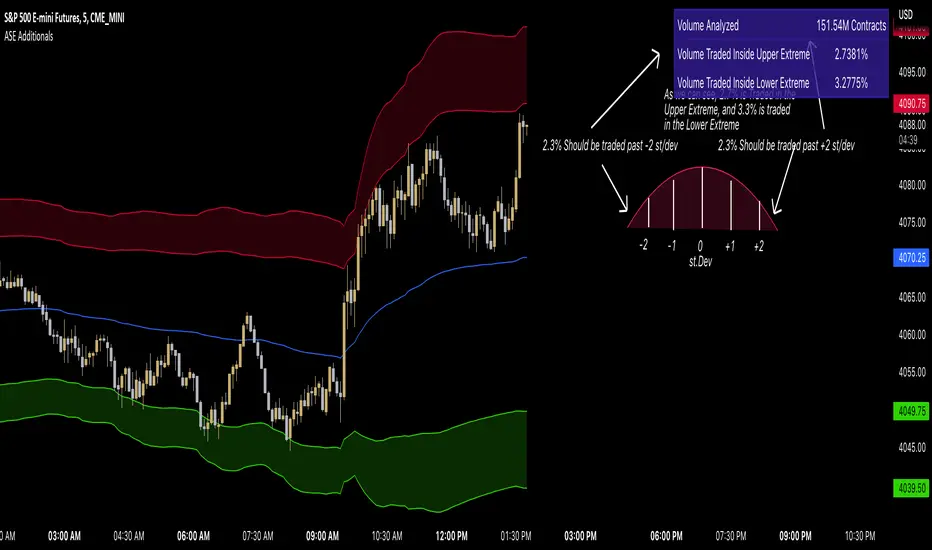 ASE Additionals is a statistics-driven indicator that combines multiple features to provide traders with valuable statistics to help their trading. This indicator offers a customizable table that includes statistics for VWAP with customizable standard deviation waves.