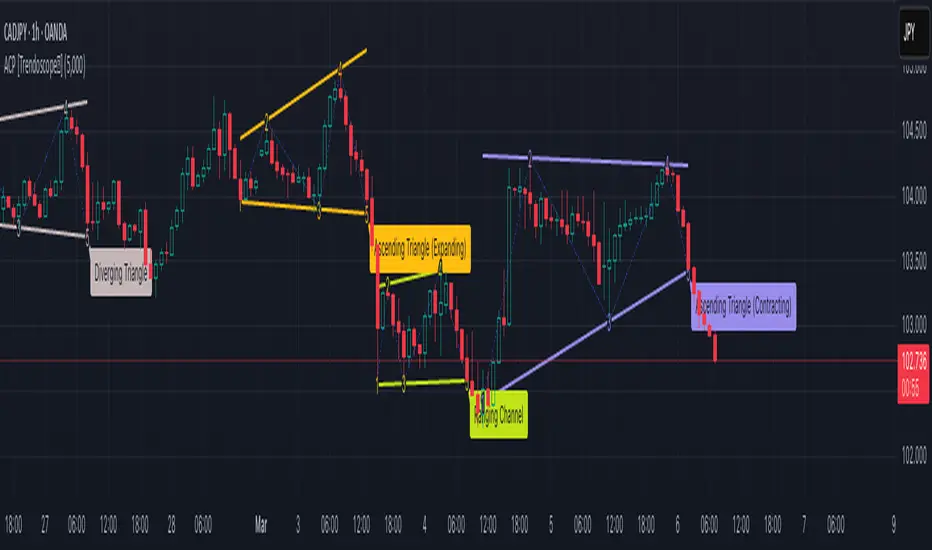 - Triangles - Converging Triangle, Diverging Triangle, Ascending Triangle Expanding, Descending Triangle Expanding, Ascending Triangle Contrcting and Descending Triangle Contracting