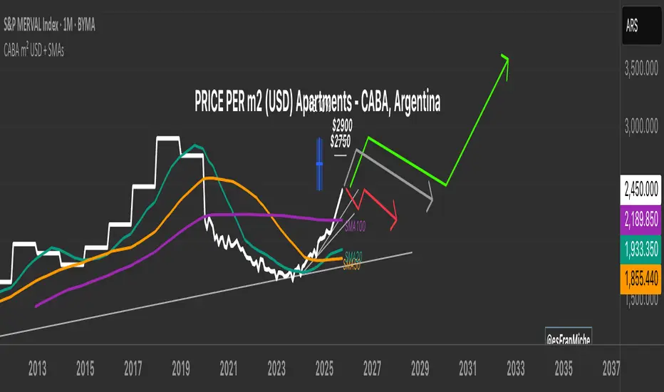 This indicator plots the historical USD price per square meter of apartments in CABA (Buenos Aires City), Argentina, combining annual data (1999–2011) from Maure Real Estate Market Reports with monthly data (2012–2025) from UCEMA and private market sources.