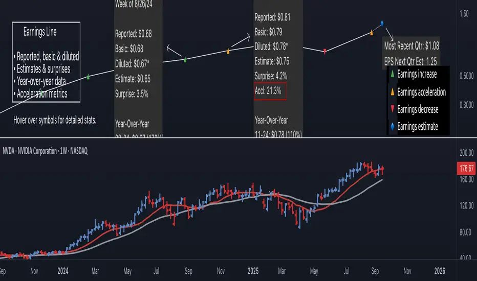 Earnings Line Pro plots quarterly earnings data, including earnings surprises and estimates, while also highlighting earnings acceleration. It allows you to track and visualize the trend of earnings across daily, weekly, and monthly timeframes.