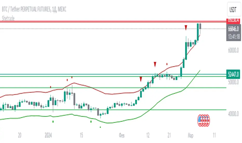 In addition to the support and resistance levels, the SheTrade indicator also includes a Bollinger band-style envelope that can be used to determine overbought and oversold conditions in the market. This envelope is based on the specified multiplier of the Average True Range indicator (ATR) and can be configured according to user preferences.