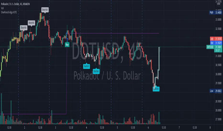 OnePunch ALGO KITE should be used with 30min or upper time limits, this is built for long term trading strategies. Make sure once you pick a crypto or stock to trade, check its backtest data: which can be found at Strategy Tester. A good strategy should always out perform the Buy & Hold for a given timeframe.