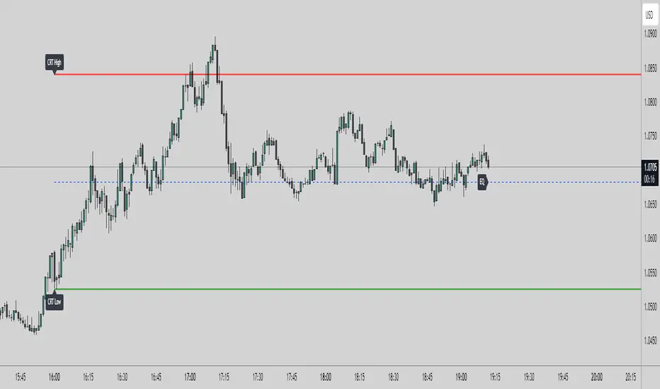ICT CRT Model Range with Equilibrium IndicatorThis indicator calculates and displays the high, low, and equilibrium levels within a custom-defined session (9:00 am to 10:00 am New York Time and the lines will stop appearing at 16:00pm ). It draws horizontal lines to represent the session's range and marks the equilibrium point as a reference.