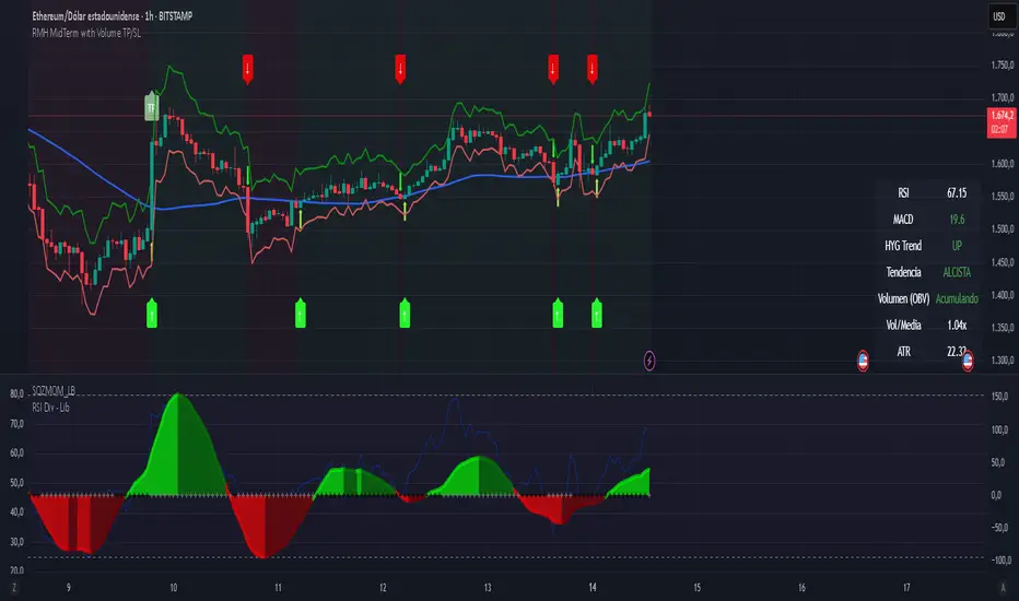 It now includes dynamic Take Profit and Stop Loss levels based on the ATR (Average True Range) and volume. When it detects unusually high volume, it automatically adjusts Take Profit levels to take advantage of larger movements. These levels are displayed with horizontal lines and are clearly marked when reached, providing a complete entry and exit strategy for medium-term trading.
