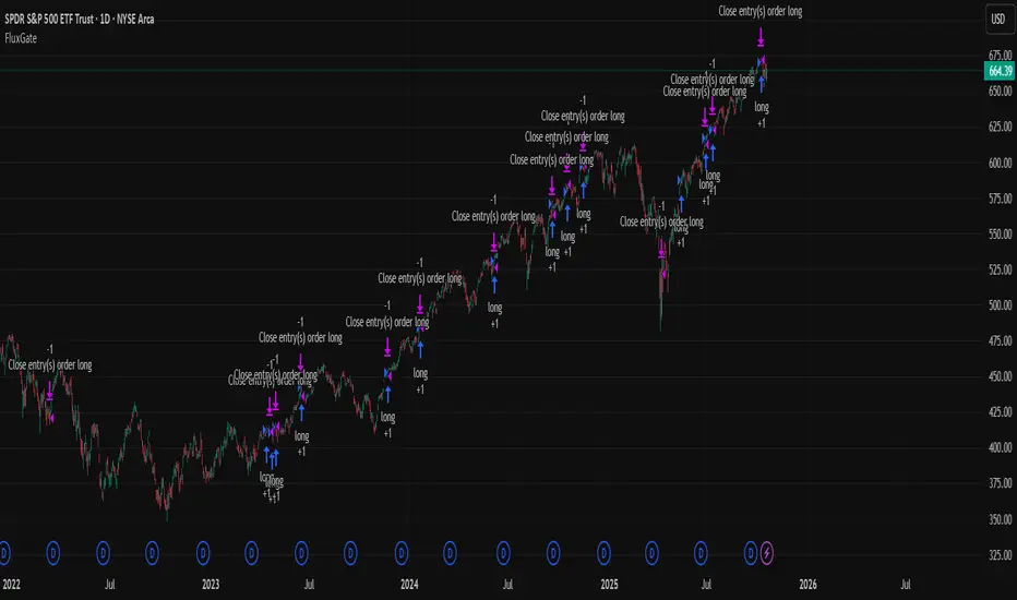 FluxGate treats long and short as different ecosystems. It runs two independent engines so the long side can be bold when the tape rewards upside persistence while the short side can stay selective when downside is messy. The core reads three directional drivers from price geometry then removes overlap before gating with clean path checks. The complementary risk module anchors stop distance to a higher timeframe ATR so a unit means the same thing on SPY and BTC. It can add take profit breakeven and an ATR trail that only activates after the trade earns it. If a stop is hit the strategy can re enter in the same direction on the next bar with a daily retry cap that you control. Add it to a clean chart. Use defaults to see the intended behavior. For conservative workflows evaluate on bar close.