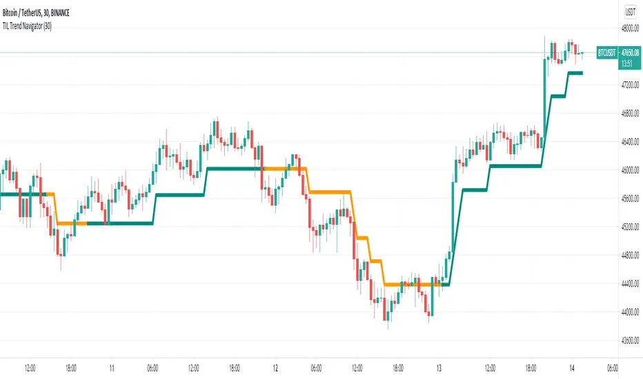 Breakouts occur when the bar crosses above or below the Trend Navigator, at which point, its line changes color to signal the change of its role as a support or resistance level.