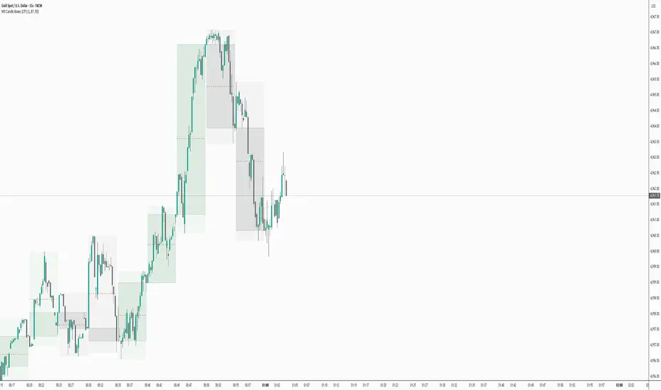 This indicator draws true 5-minute candle structures on any timeframe below 5 minutes. It builds the M5 candle using intrabar data, then plots a high-low box, a darker open-close box, and a dashed midpoint line once each 5-minute candle closes. Designed for precision on lower timeframes without repainting.