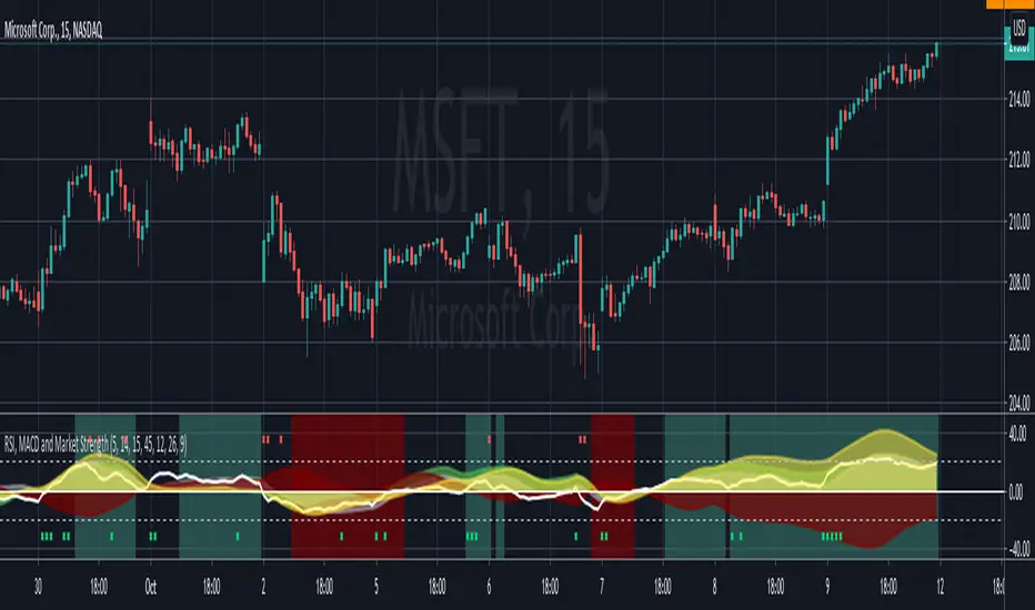 The background color changes when the market strength combined with the active symbol RSI and higher timeframe MACD signals are aligned. Green is a buy zone, Red is a sell zone.