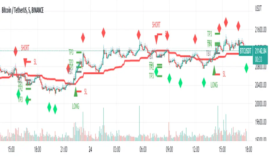 When certain indicators of the algorithm are reached, signals appear that are displayed in the form of a triangle directed in a certain direction, green (up) It's long, red (down) it's a short. Also, the entry point to the position will appear on the next candle.