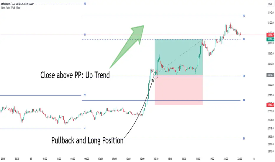 A breakout through pivot lines provides a significant signal to the trader, indicating a change in market sentiment. When an upward breakout occurs and the price crosses these lines, a trader can enter a long position and place their stop-loss below the pivot point (P).