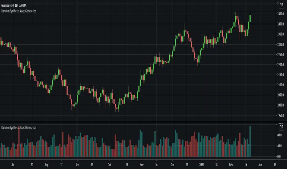 This script generates pseudo-random asset data. Due to the nature of the random generator, it is impossible to use this indicator as input for other indicators because the instance of the script that the indicator is applied to will automatically be different from the instance that is plotted on the chart. Therefore, the idea is to use this script in other scripts (to make it possible to backtest on random data, for example).