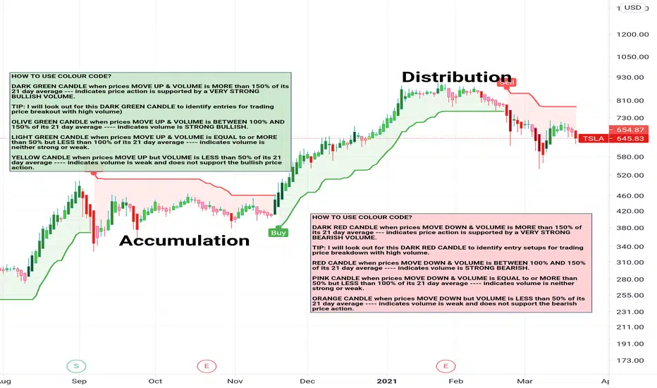 DARK GREEN CANDLE when prices MOVE UP & VOLUME is MORE than 150% of its 21 day average --- indicates price action is supported by a VERY STRONG BULLISH VOLUME.